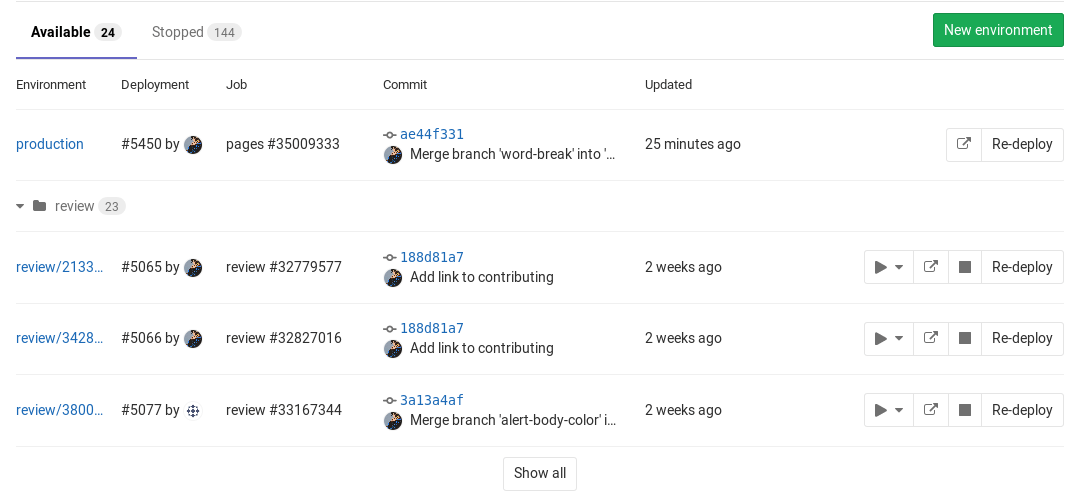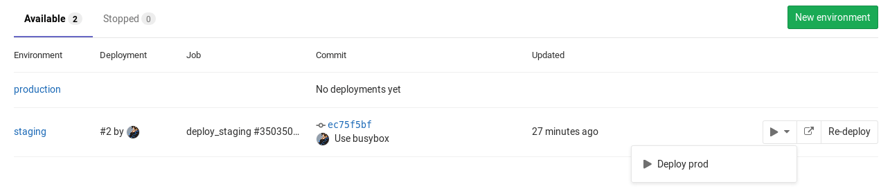 .gitlab-ci.ymlfirst. They will be automatically created for you after the first deploy.- The environments page can only be viewed by Reporters and above. For more information on the permissions, see the permissions documentation.