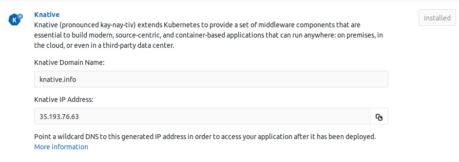 Domain Name: Knative will provide its own load balancer using Istio. It will provide an external IP address for all the applications served by Knative. You will be prompted to enter a wildcard domain where your applications will be served. Configure your DNS server to use the external IP address for that domain.